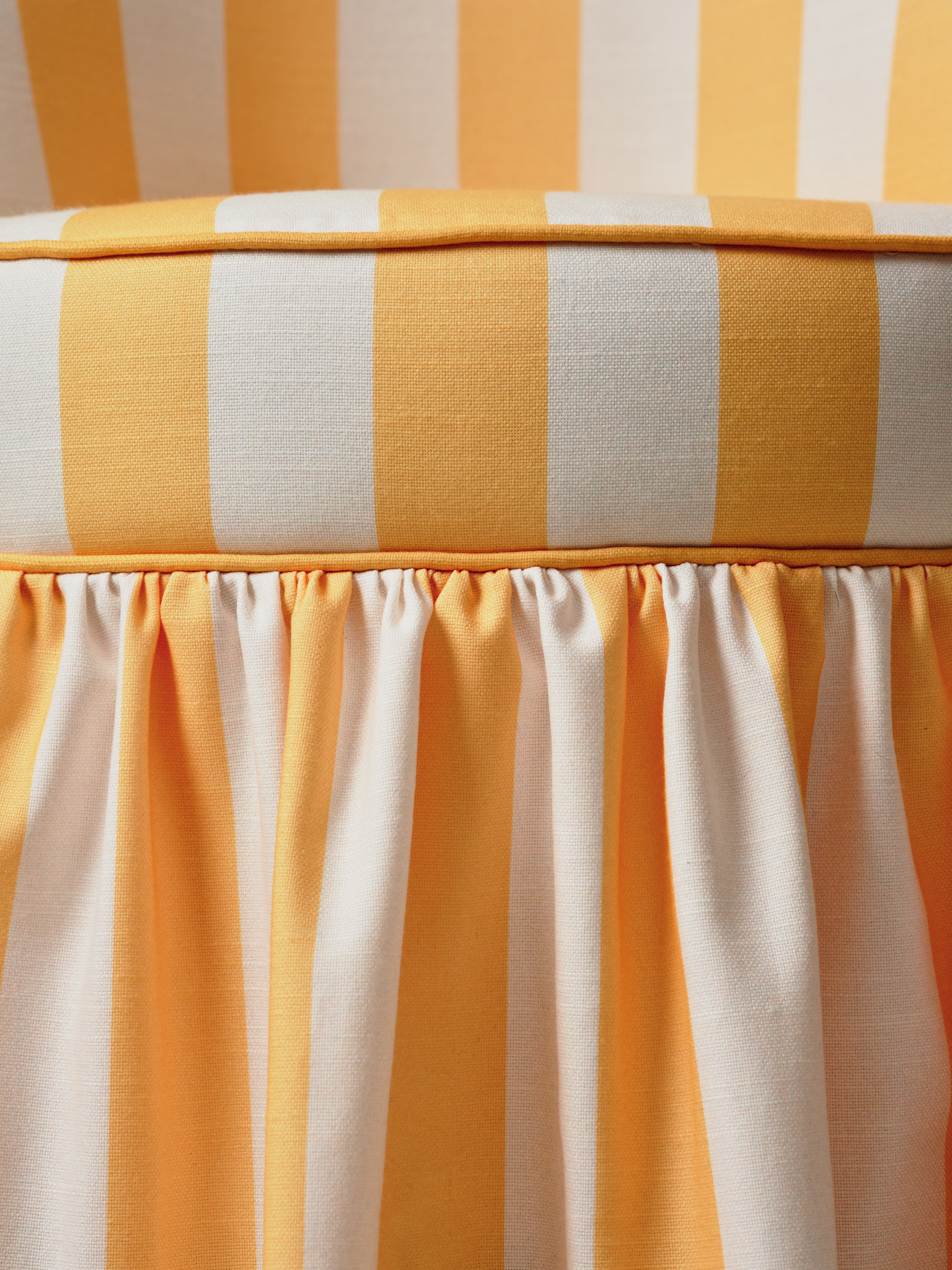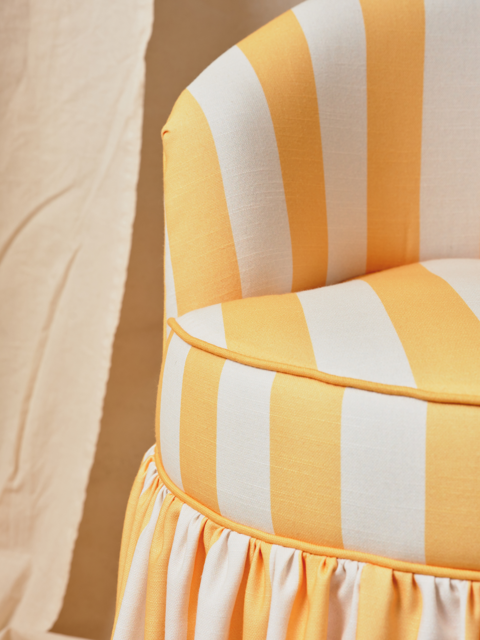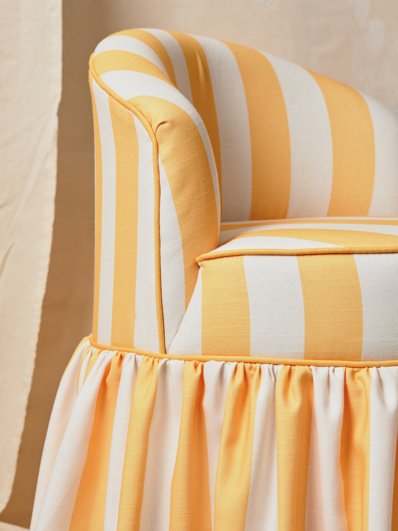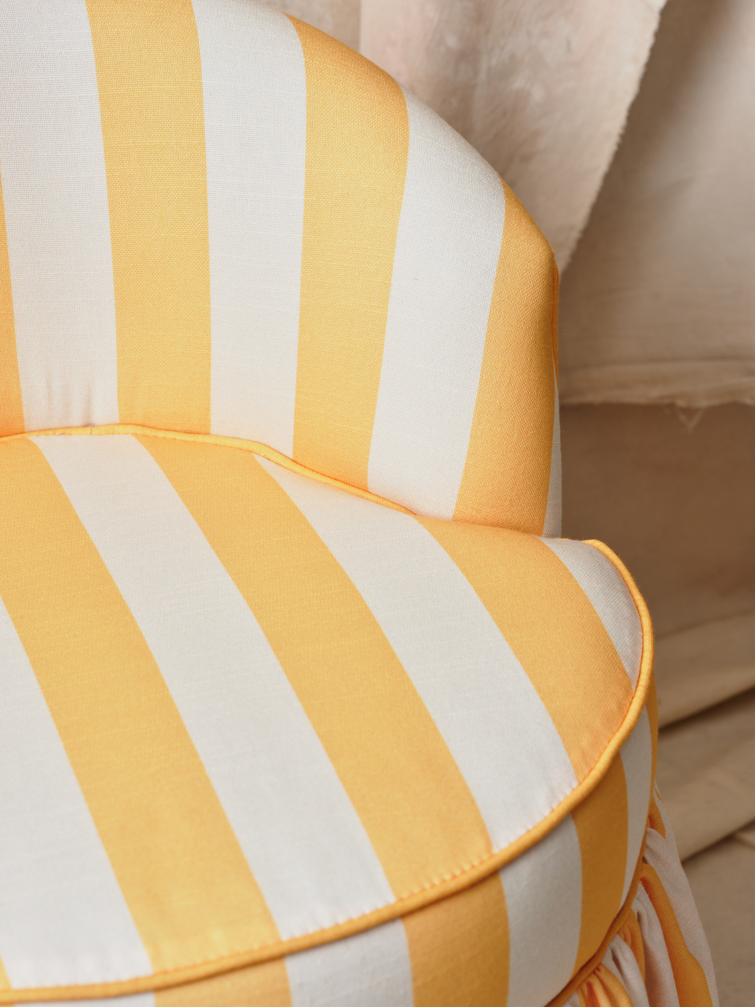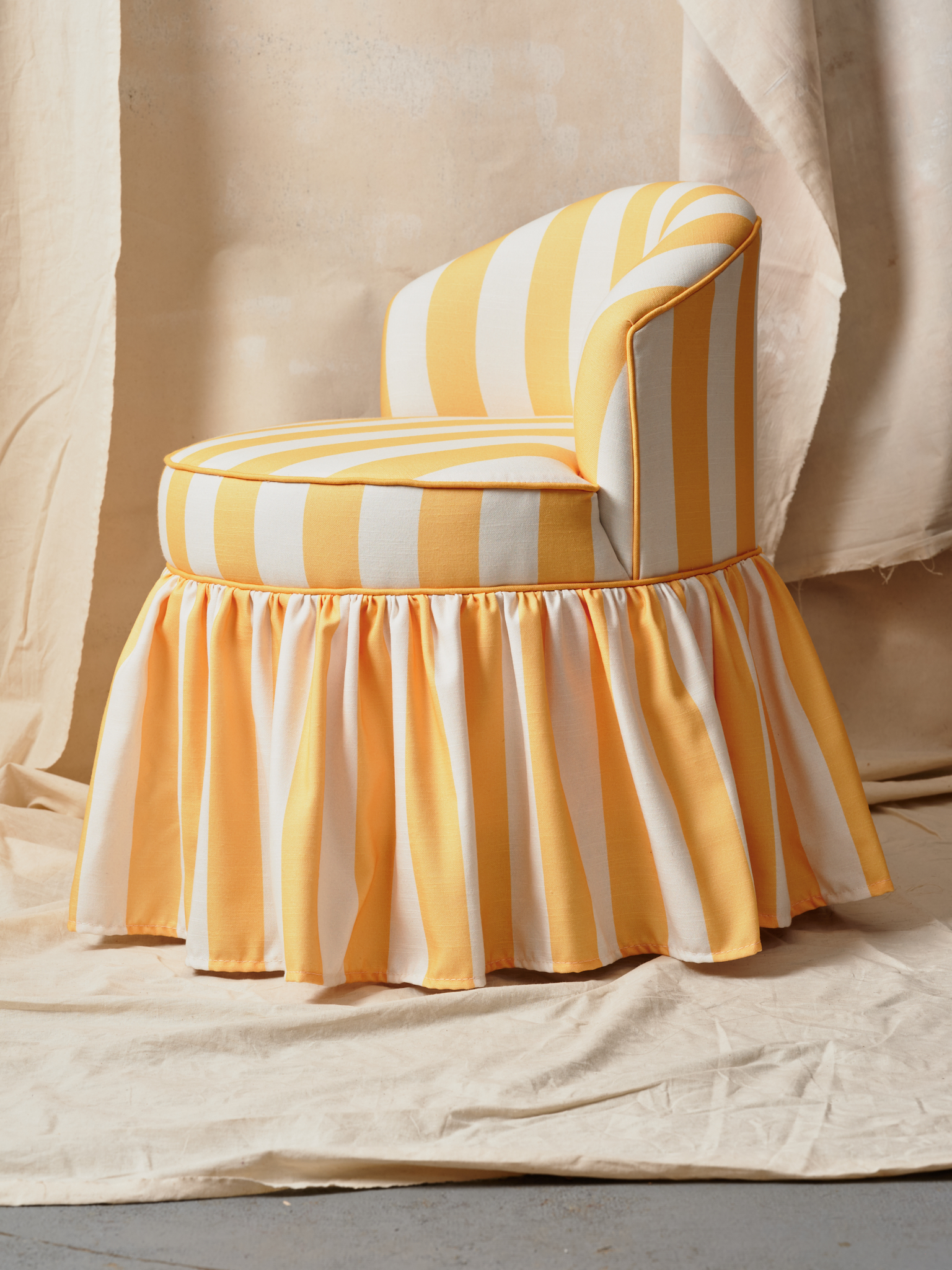 Our ‘Stripe & Skirt’ Armchair in our Marshmallow & Piccalilli midi stripe linen fabric, is inspired by local countryside homes we have visited in Derbyshire over the years. With a low back and beautifully finished with a piped edge and skirt, this armchair is perfect for use with a dressing table, desk or additional guest seating in a reception room.