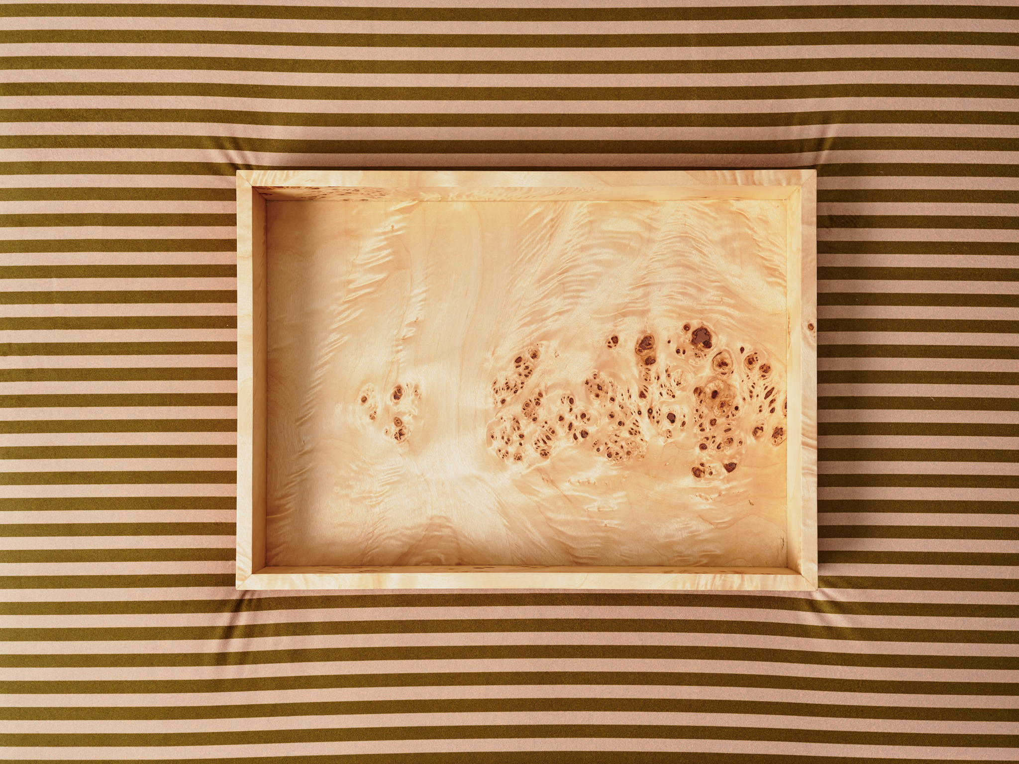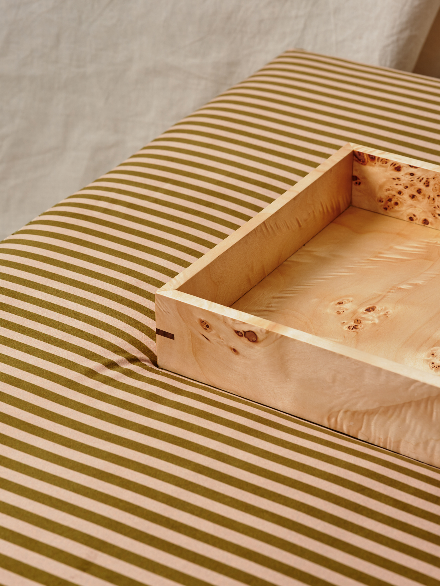The muted stripe colourway in a subtle petite stripe with the warm tones of the burl tray, makes this piece suitable for both contemporary and mid-century, retro interior design. Our burl wood tray with its beautiful grain also gives this piece a dynamic and organic feel (please note trays vary depending on the individual grain of burl used).