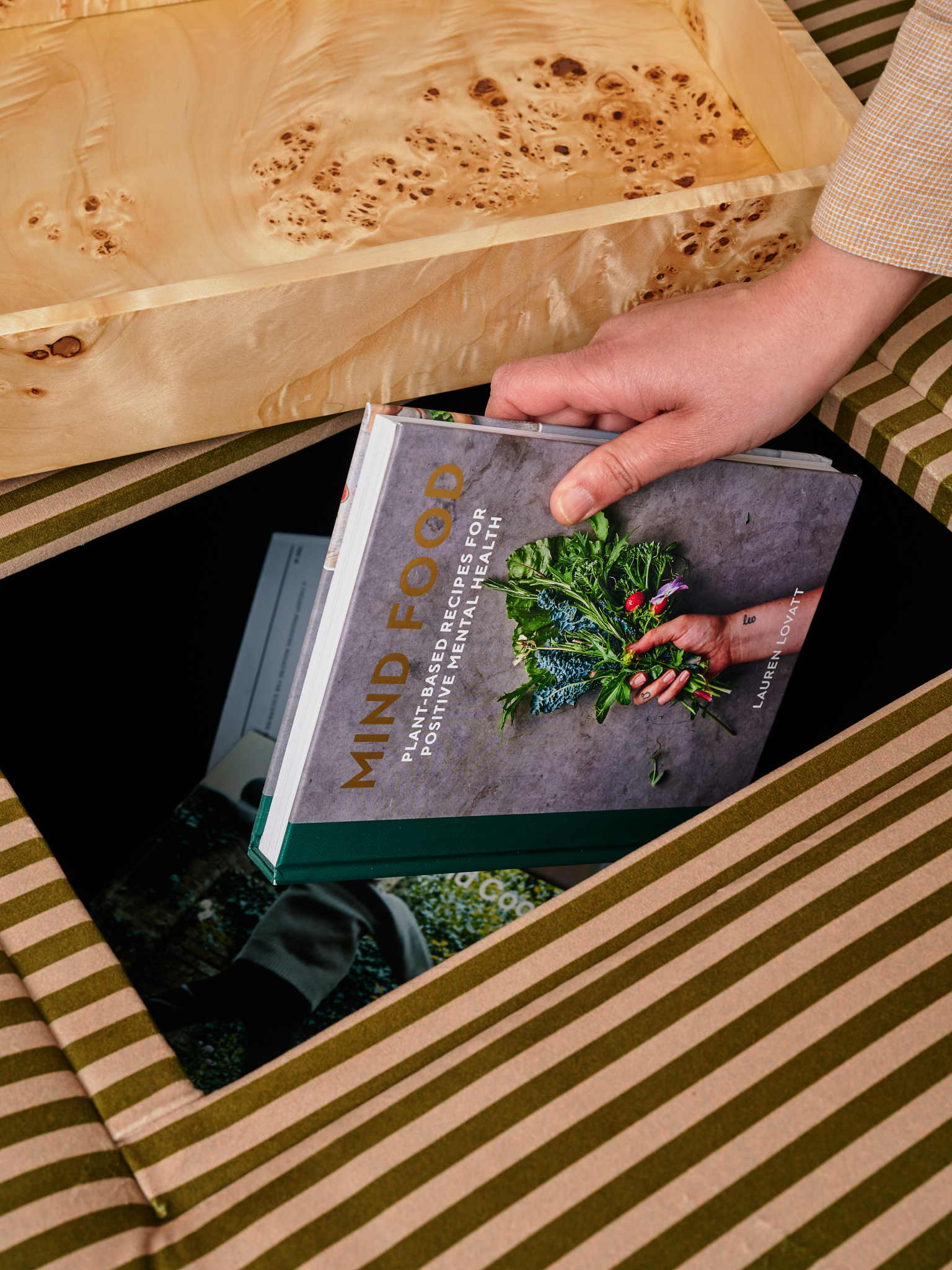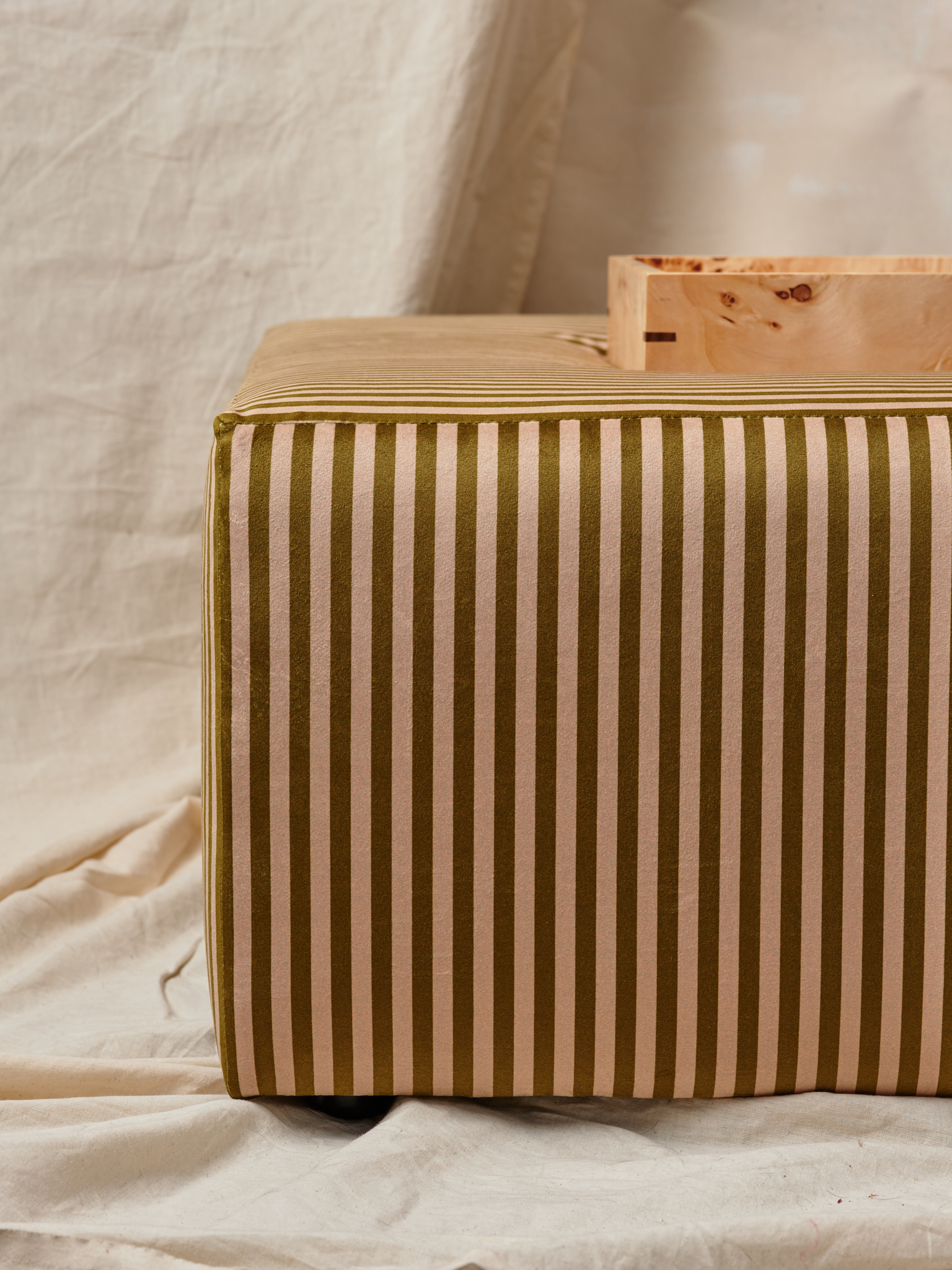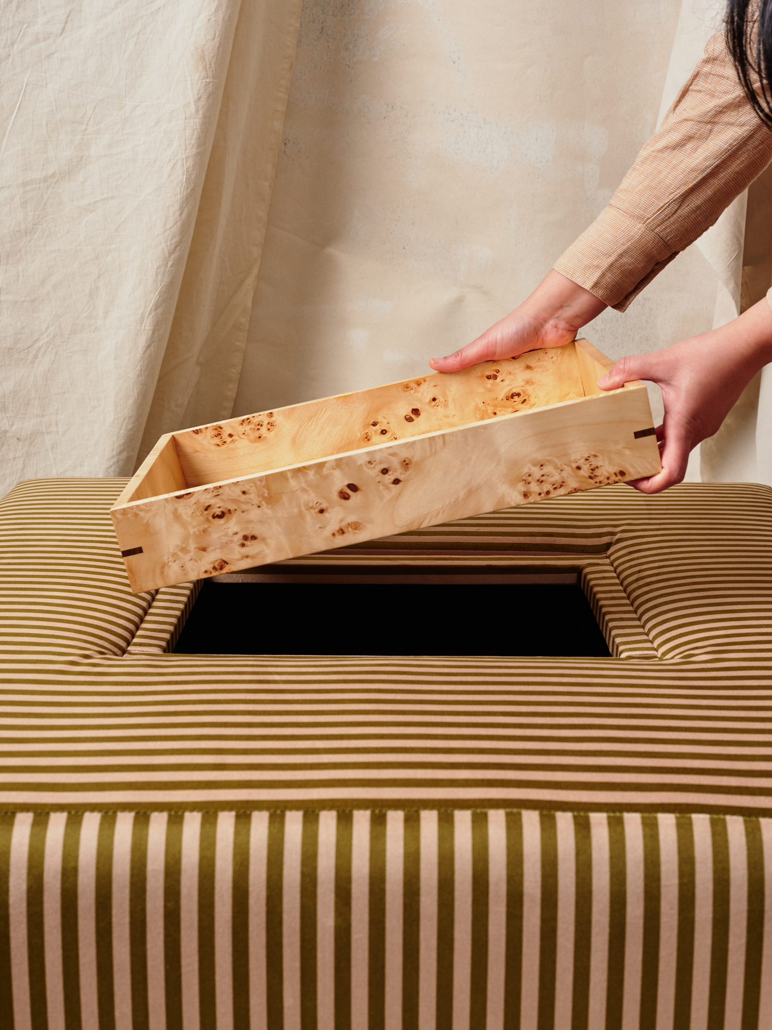Our ‘Stripe & Burl’ Footstool in our Olive & Roasted Sesame petite stripe velvet fabric, is inspired by mid-century modern design. We have given this piece a rigid build with minimal ornamentation and combined this with functionality. The tray provides a stable space to hold drinks and decorative pieces which can be conveniently lifted to provide storage for books, toys, and blankets etc.