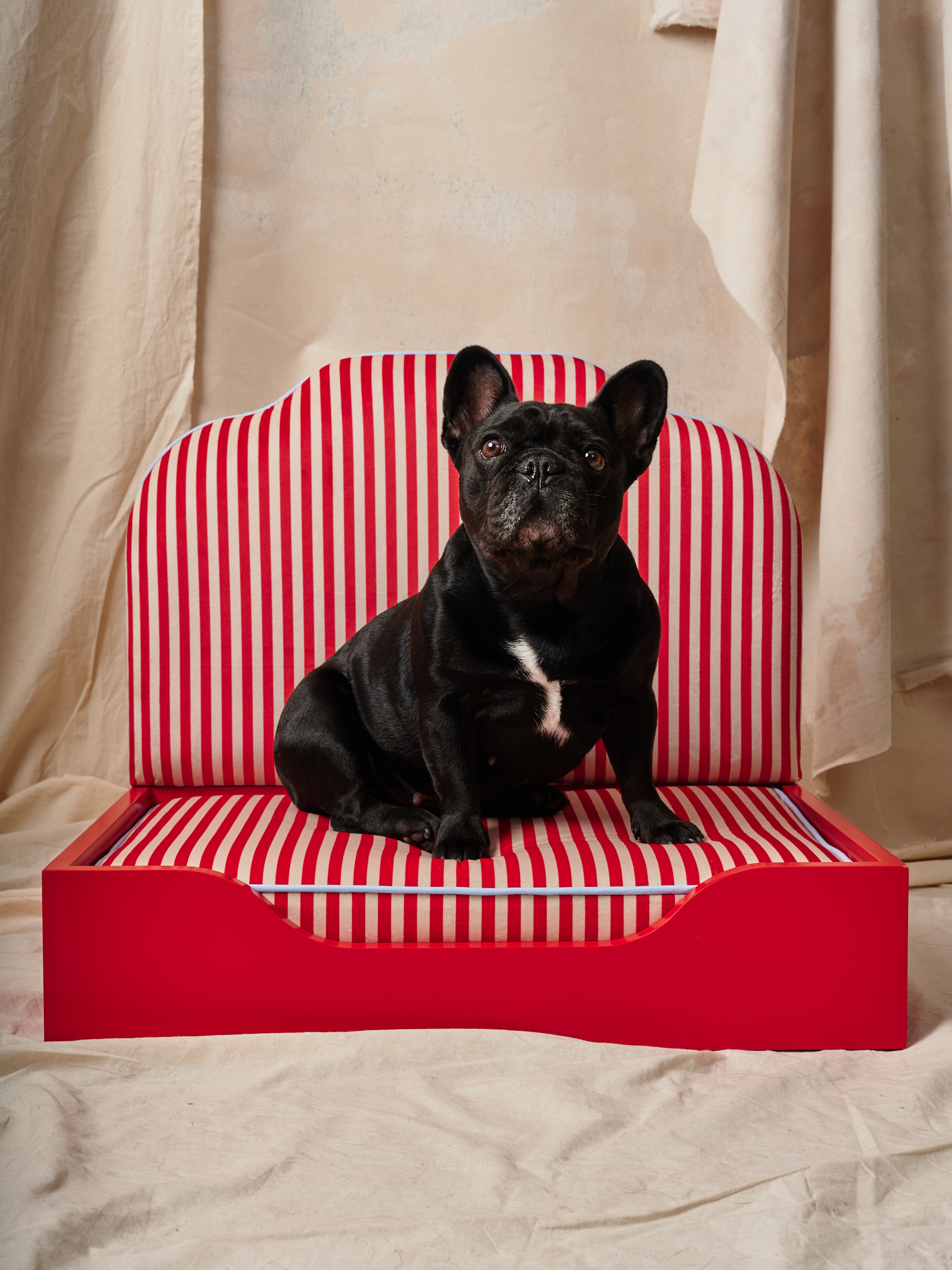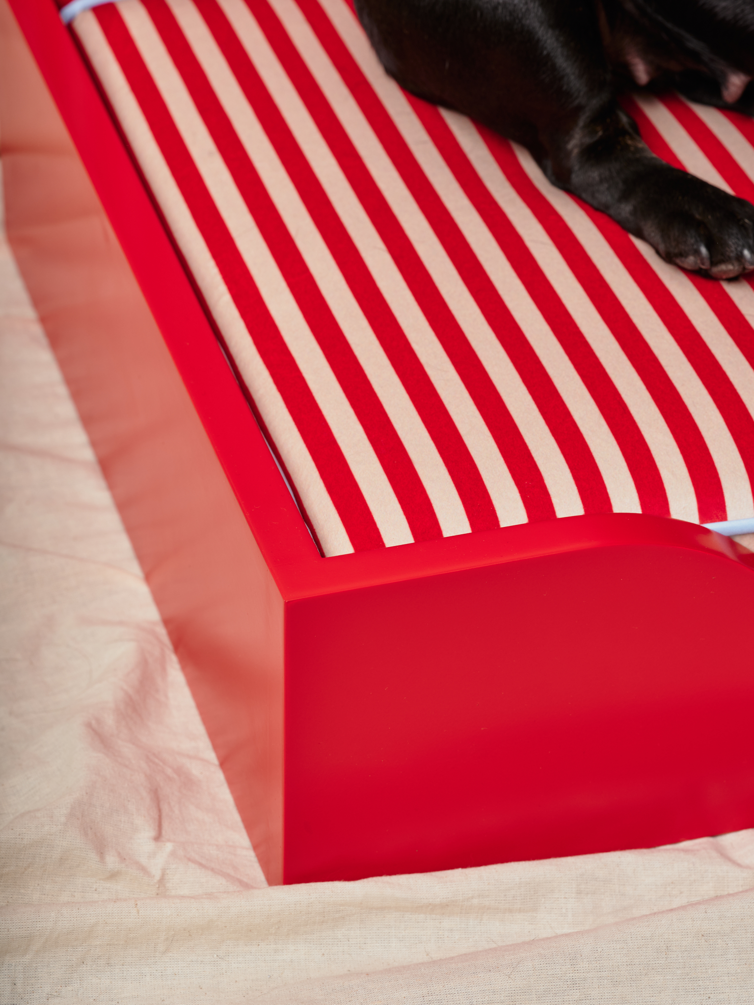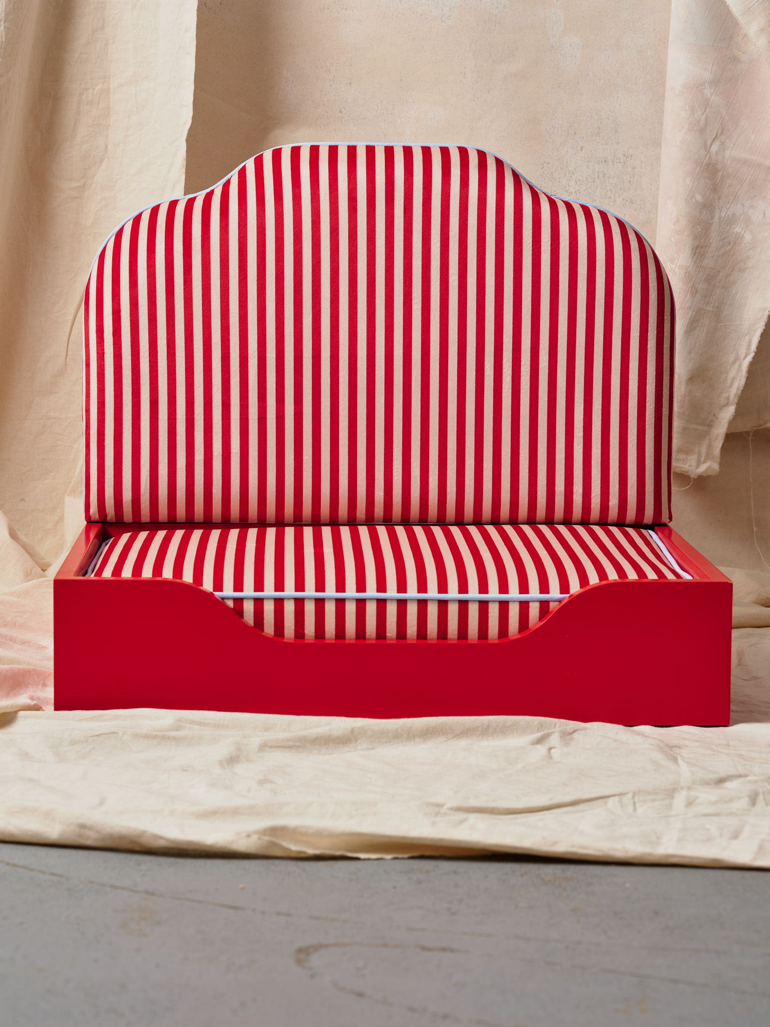 This specific colourway of Lipstick Red & Sesame in velvet petite stripe with Baby Blue piping is inspired by maximalist interior design to show how fun and creative you can get designing your own bespoke dog bed to suit your interiors. With our design, this dog bed can seamlessly blend into any interior with either a muted colourway and wood base or wider stripe.