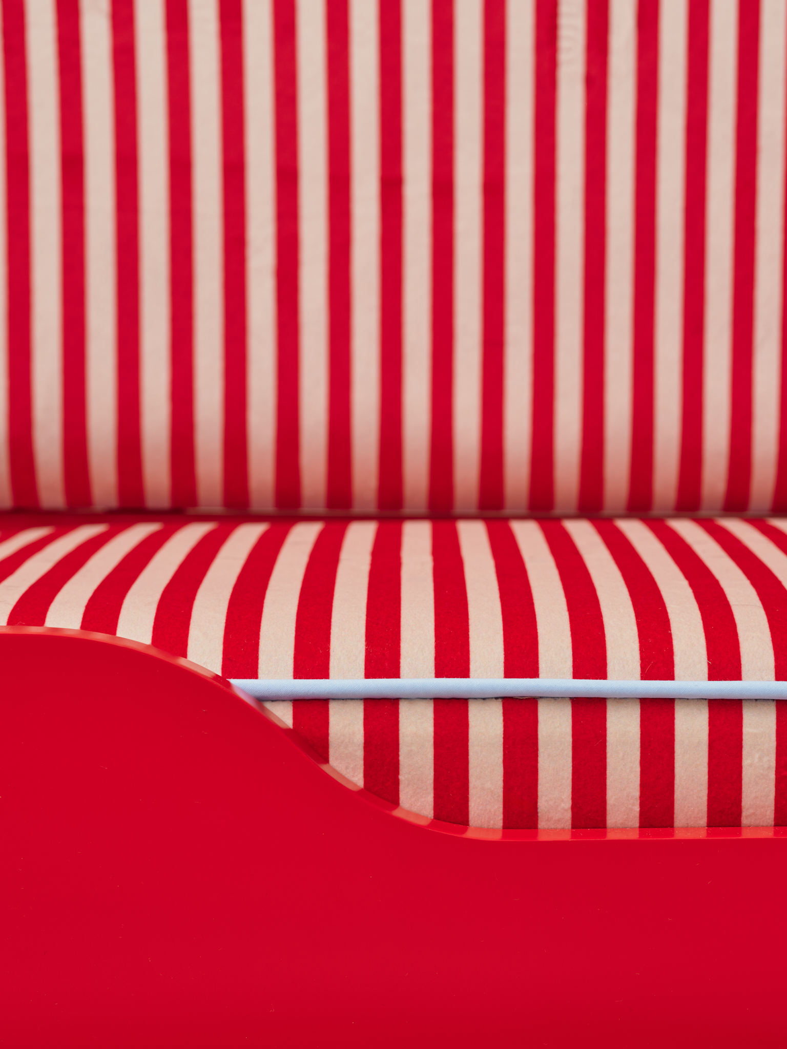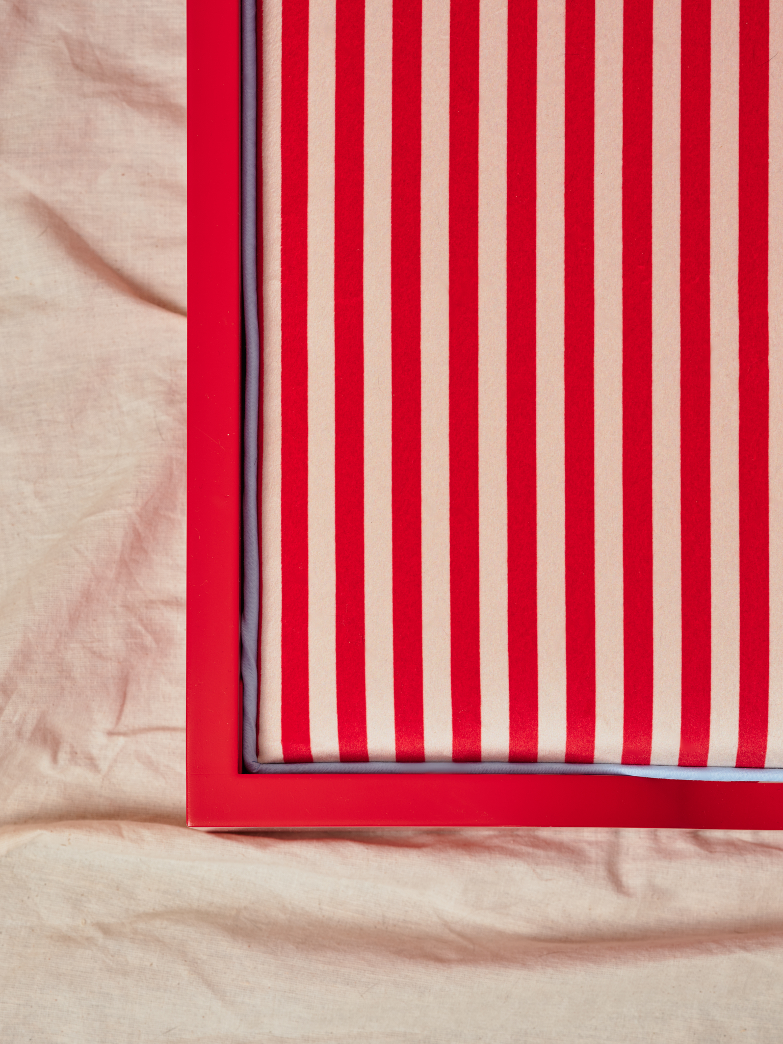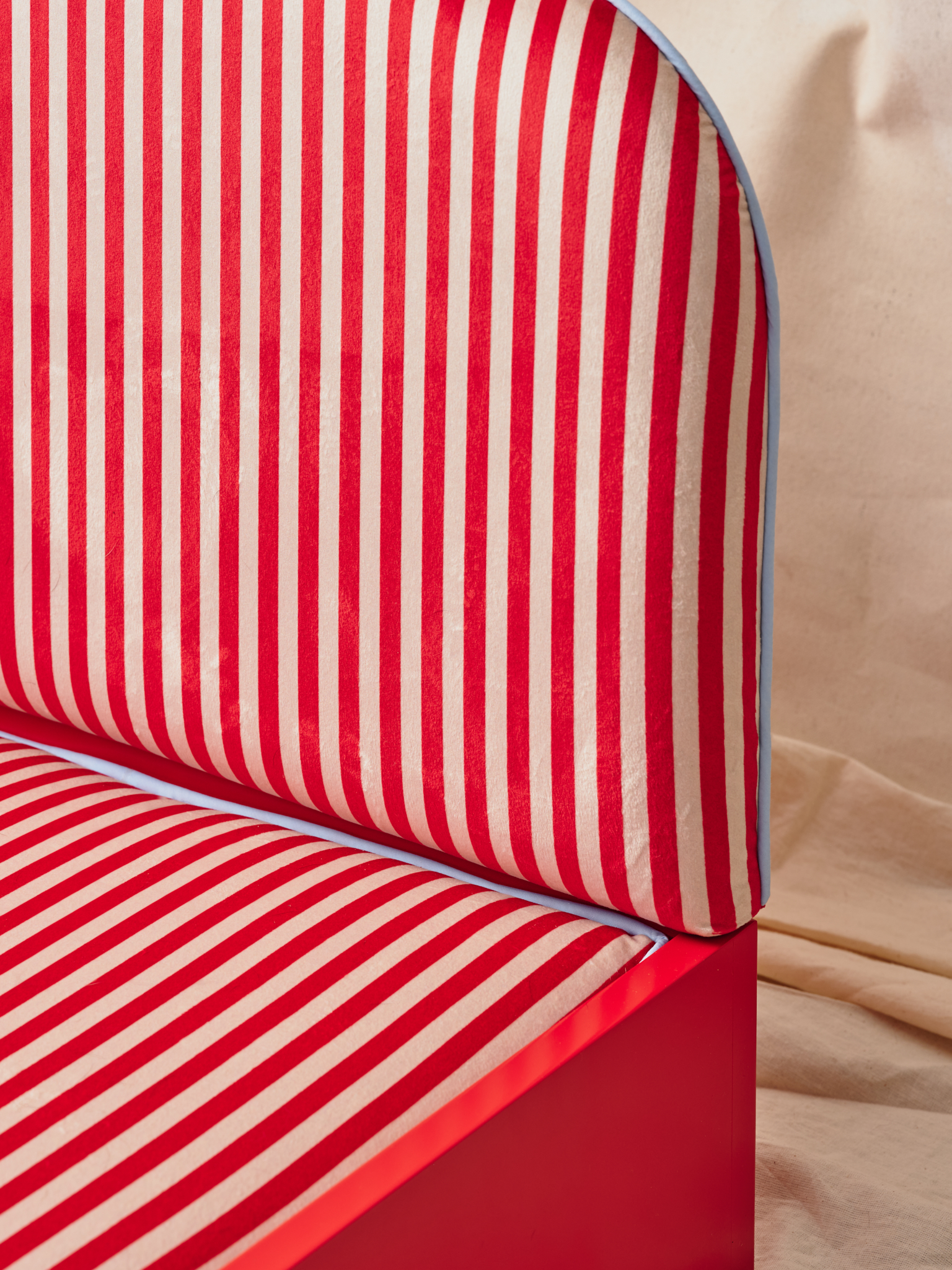 This specific colourway of Lipstick Red & Sesame in velvet petite stripe with Baby Blue piping is inspired by maximalist interior design to show how fun and creative you can get designing your own bespoke dog bed to suit your interiors. With our design, this dog bed can seamlessly blend into any interior with either a muted colourway and wood base or wider stripe.