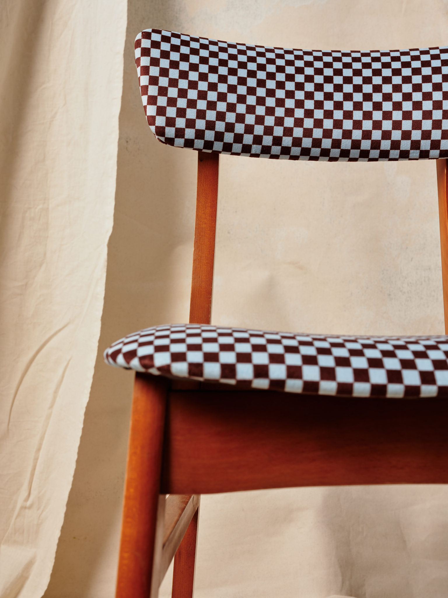 A pair of 1970s mid-century Schreiber teak chairs upholstered in our Cocoa & Moonlight mini check velvet fabric (check fabric coming soon). These chairs showcase how our fabric can uplift and elevate mid-century and other furniture. Use our bespoke fabric creator to create your bespoke stripe (and soon check) fabric in your chosen colourway.